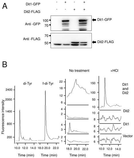 To further characterize Dit1, it was expressed in vegetative cells under the control of an inducible GAL1 promoter (Figure 3B). Dit1-GFP expressed in vegetative cells was observed in the cytosol (Figure 3A). To analyze formyl tyrosine production in the Dit1-expressing cells, the cell lysate was subjected to HPLC analysis. Although a peak similar to formyl tyrosine was detected in the lysate of Dit1-GFP-expressing cells, the same peak was also detected in the control cell lysate (Figure 3C). Furthermore, the height of the peak was not significantly altered by the expression of Dit1-GFP (Figure 3C), suggesting that this peak is not formyl tyrosine. In a previous study, we showed that Dit2 expressed in vegetative cells was active and could crosslink formyl tyrosine [11]. Thus, to verify whether Dit1 was active in vegetative cells, Dit1-GFP and Dit2-FLAG were coexpressed in vegetative cells. Both Dit1-GFP and Dit2-FLAG were expressed under the control of the GAL1 promoter (Figure 4A). As reported, previously, we could not detect bisformyl dityrosine under our experimental conditions [11]. Nevertheless, we detected dityrosine in the lysate of cells expressing Dit1-GFP and Dit2-FLAG after hydrolysis with HCl (Figure 4B). Dityrosine was not detected when either Dit1 or Dit2 was solely expressed (Figure 4B). Thus, Dit1-GFP is active in vegetative cells.