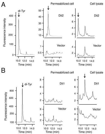 Then, we examined whether Dit1-GFP-expressing cells were permeabilized in the lysate of Dit2-expressing cells; therefore, Dit1-GFP-expressing cells were mildly lysed, and the lysate was immediately incubated with Dit2. Under this condition, we detected dityrosine in the hydrolysate of the reaction mixture (Figure 5B). Thus, we speculated that formyl tyrosine might be unstable and react immediately with other molecules in the lysate.