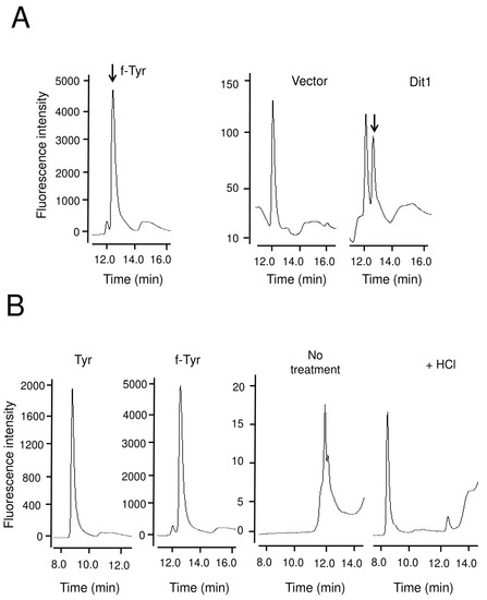 Trisodium citrate treatment of yeast lysates and formyl tyrosine detection. (A) The lysate of vegetative cells harboring pRS424GAL1-DIT1-GFP (Dit1) or pRS424GAL1 (Vector) were treated with trisodium citrate and subjected to HPLC analysis. Formyl tyrosine (f-Tyr) is shown as a control. Arrows indicate formyl tyrosine peaks. (B) The formyl tyrosine peak detected in the lysates of vegetative cells harboring pRS424GAL1-DIT1-GFP was collected, hydrolyzed with 6 N HCl and subjected to HPLC analysis. Tyrosine (Tyr) and formyl tyrosine (f-Tyr) are shown as controls.