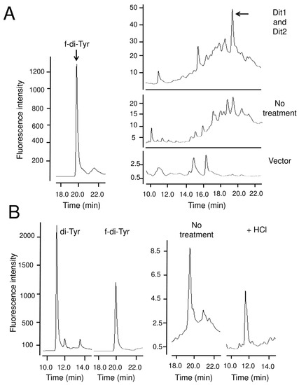The absence of formyl tyrosine in the lysate of Dit1-GFP-expressing vegetative cells was further verified by an in vitro Dit2 assay. Dit2 expressed in vegetative cells retained its activity in permeabilized cells [11]. We also found that Dit2 was active in the cell lysate; when formyl tyrosine molecules were added to the cell lysate harboring Dit2, dityrosine was detected in the hydrolysate of the reaction mixture (Figure 5A). However, we could not detect dityrosine when the lysate of Dit1 expressing cells was incubated with the lysate of Dit2 expressing cells (Figure 5B).