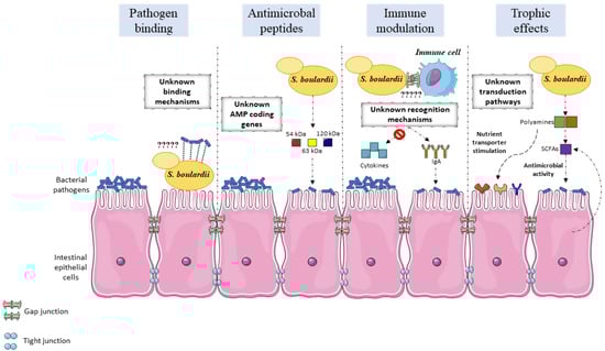 Antagonism against pathogens can be achieved by colonization and exclusion of pathogens, modulation of metabolic and signaling pathways, production of inhibitory compounds or immune modulation [31]. Competition is one of the main mechanisms associated with probiotic activity against gut pathogens: consumption of nutrients by probiotics results in nutrient limitation for pathogenic organisms [31,35]. On the other hand, the ability of probiotics to grow and colonize the gut can lead to a decrease of the gut pH due to the production of metabolites, leading to stressful conditions for pathogens [35]. A possible role for S. boulardii in managing pathogenic activity was associated with a protective effect of S. boulardii against pathogenic bacteria in yeast-treated mice, although the mode of action is not associated with a reduction of the pathogenic population [21], as well as with another study which observed a protective effect against Candida albicans in a murine model [36].