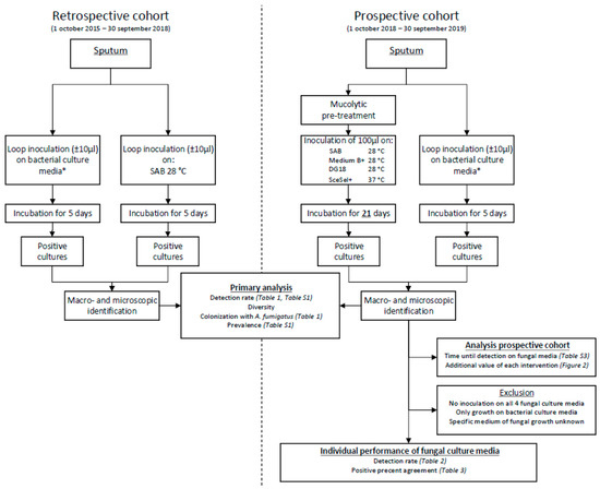 Both cohorts: Direct loop inoculation of an unstandardized amount (±10 μL) of sputum on bacterial culture media (Columbia III Agar with 5% Sheep Blood 36 °C CO2, Chocolate Agar with IsoVitaleXtm and Bacitracine 36 °C anaerobe, MacConkey agar 36 °C O2 (Becton Dickinson, Franklin Lakes, NJ, USA), Burkholderia cepacia selective Agar 36 °C O2 and Chapman agar 36 °C O2 (Oxoid, Basingstoke, UK). All plates were incubated for 5 days and were evaluated daily for the presence of fungal (and bacterial) growth. The excessive growth of yeasts was reported in both cohorts but not evaluated in this study. Molds were identified by their macroscopic and microscopic morphology. A visual overview of the study protocol can be found in Figure 1.