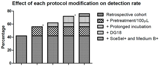 Effect of each protocol modification on fungal detection rates. Retrospective cohort; the detection rate of any mold of the retrospective cohort + Pretreatment/100 μL; the detection rate of prospective cohort after 1 week of incubation on Sabouraud (SAB) with mucolytic pretreatment and inoculation of 100 μL sputa + Prolonged incubation; the detection rate after 3 weeks of incubation on SAB with mucolytic pretreatment and the inoculation of 100 μL sputa + DG18; the detection rate after 3 weeks of incubation on SAB and Dichloran-Glycerol Agar (DG18) with mucolytic pretreatment and inoculation of 100 μL sputa + SceSel+ and Medium B+; the detection rate after 3 weeks of incubation on SAB, DG18, Scedosporium selective agar (SceSel+) and medium B+ with mucolytic pretreatment and inoculation of 100 μL sputa. * Significant increase compared to the previous column.
