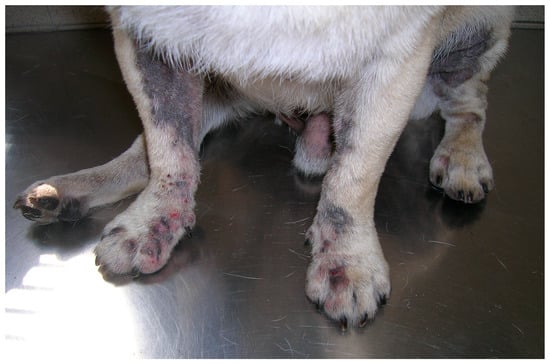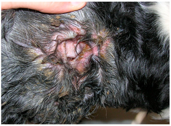 Processes involved in colonisation and infection include the adherence of the yeast to stratum corneum cells, the secretion of hydrolases, and the innate and adaptive immune responses of the host [5]. Underlying conditions leading to MD include hypersensitivity diseases (atopic dermatitis, adverse cutaneous food reactions, flea bite hypersensitivity, and contact allergy), keratinisation disorders, ectoparasite infections, bacterial pyoderma, endocrine diseases (hyperadrenocorticism, hypothyroidism, diabetes mellitus), and autoimmune diseases [6,30]. Cases of MD without apparent underlying causes have been also reported [31]. Genetic predisposition appears to be important in certain breeds, especially West Highland white terriers, Basset hounds, dachshunds, cocker spaniels, Shih Tzus, and English setters [30].
