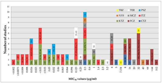 Support for the idea that variability is largely determined by the use of different test conditions comes from the MICs reported for a reference strain (CBS 1879, considered the type strain of M. pachydermatis) (KTZ: <0.03 µg/mL [50], 0.25–0.5 µg/mL [72], 1.25 µg/mL [70]; ITZ: ≤0.03 µg/mL [73], 1.6 µg/mL [66]; TER: ≤0.03 µg/mL [73], 3.2 µg/mL [66]; NYS: 0.63 µg/mL [70], 5 µg/mL [74]) and the results obtained in some studies after the application of two different tests or different test conditions (e.g., ITZ MIC90 by a broth microdilution technique: 0.5 µg/mL, by E-test®: 0.016 µg/mL [67]; ITZ MIC90 in Christensen urea broth + Tween 40/80: 0.125 µg/mL, in Sabouraud Broth + Tween 80: <0.008 µg/mL [49]).