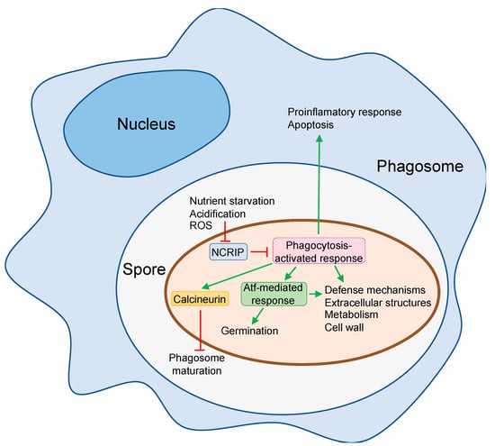 - Pérez-Arques, C.; Navarro-Mendoza, M.I.; Murcia, L.; Lax, C.; Martínez-García, P.; Heitman, J.; Nicolás, F.E.; Garre, V. Mucor circinelloides thrives inside the phagosome through an Atf-mediated germination pathway. MBio 2019, 10, e02765-18. [Google Scholar] [CrossRef]