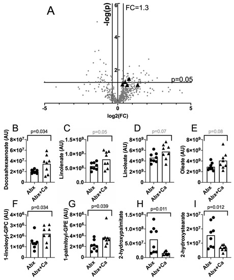 To identify the compounds from pathways enriched in ceca of C. albicans-colonized mice, we used the pathway enrichment tool within MetaboAnalyst. Analyzing only statistically significantly different compounds revealed no known pathways, but including compounds that showed a trend towards significance (p < 0.1) allowed the detection of one pathway: five compounds in the linoleic (C18:2) and linolenic (C18:3) acid metabolism pathway (Figure 1A, black triangles, Figure 1B) were present at higher levels in C. albicans-colonized mice. All three 18-carbon non-esterified unsaturated fatty acids showed trends toward higher levels in C. albicans-colonized mice (Figure 1C–E). Furthermore, the increase in lyso-phospholipids (Figure 1F,G) could indicate a hydrolysis of phospholipids and the release of non-esterified fatty acids while the decrease in hydroxy fatty acids (Figure 1H,I) could indicate a reduced conversion of fatty acids into other forms. Therefore, the results showed altered levels of lipid compounds, including non-esterified, unsaturated fatty acids, in the cecum contents of C. albicans-colonized mice.