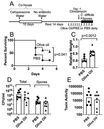 We proposed that the levels of lipid compounds in the GI tract influence the course of CDI in antibiotic-treated mice. To initiate the test of this hypothesis, we analyzed the effects of increasing levels of unsaturated fatty acids and other lipid compounds through feeding. The mice were treated with cefoperazone and clindamycin as described above and shown in Figure 2A. Importantly, no mice were given C. albicans for this set of experiments. After two weeks of resting post-cefoperazone treatment, the mice were orally administered a modest amount of olive oil daily for 1 week prior to the C. difficile challenge and continuing to the end of the experiment. The timeline of this experiment is shown in Figure 2A. In a pilot experiment, the mice received either olive oil (composed predominantly of triglycerides containing oleic acid (C18:1)) or fish oil (source of long-chain poly-unsaturated fatty acids such as DHA), orally with PBS (Supplementary Table S3). The results of this pilot experiment suggested that larger amounts of both oils had some effect and olive oil had a slightly stronger effect. Although fish oil contains long-chain poly-unsaturated fatty acids, some of its components have anti-inflammatory effects and fish oil administration is sometimes protective and sometimes not protective against infectious challenge [66]. Olive oil, in contrast, is composed primarily of triglycerides containing oleic acid (C18:1), a compound that showed a trend towards higher levels in the ceca of C. albicans-colonized mice (Figure 1E).
