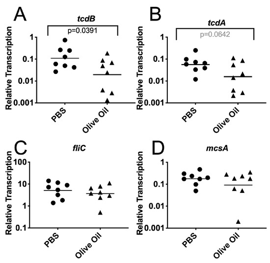 We also analyzed the C. difficile gene transcription in the bacterial cells recovered from infected mice. The mice were treated as shown in Figure 2A and sacrificed two days post-challenge with spores. The ceca were dissected, opened and washed twice in RNA protect. The washed cecum wall was then scraped into RNAprotect to recover the epithelium and enrich for epithelium-associated bacteria. The RNA was extracted from the samples and the C. difficile gene transcription was measured using RT PCR as described in the Materials and Methods. The C. difficile toxin genes tcdB and tcdA were transcribed at high enough levels to be detected in these mixed samples. Other C. difficile genes were poorly expressed and a pre-amplification method was used to increase the sensitivity of detection. This pre-amplification consisted of 12 rounds of PCR using only one sense strand primer and increased the sensitivity while retaining the quantitative assessment of gene transcription (Supplementary Figure S2). The transcription of the toxin gene tcdB was significantly lower in epithelium-associated C. difficile cells from olive oil-fed mice (Figure 3A, t test p = 0.0391). The transcription of tcdA showed a trend towards lower transcription in olive oil-fed mice (t test p = 0.0642). Other genes such as fliC or mcsA (CDR20291_0013) did not show significant differences in their transcription. These results indicate that although the overall toxin levels in the cecum contents were not significantly different, the possible ability to produce toxin (specifically TcdB) by C. difficile cells in the vicinity of the epithelium was affected by the treatment with olive oil. These results are consistent with the observation that olive oil feeding reduced the virulence of C. difficile, but this reduction in virulence is most likely multifactorial.