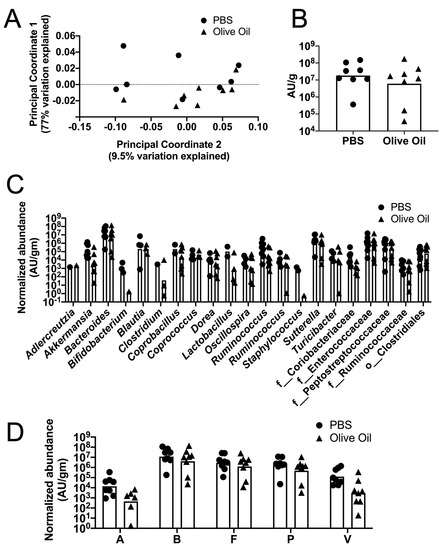 To test for possible differences in the specific genera within the microbiota between the PBS and olive oil-fed groups, we compared the abundance of bacterial genera, normalized to the total level of bacteria per milligram of cecum sample. Normalization was used to account for the differences in the total levels of bacteria per mg of sample. All the bacterial genera with a median fraction greater than 0 in at least one of the two groups were included in order to identify the consistently observed genera (Figure 4C). These mice had received multiple antibiotic treatments and were infected with C. difficile, and they were colonized with relatively few genera. We detected a total of 44 genera and 16 exhibited a median greater than 0 in at least one group. The normalized abundance of the genera was compared between the PBS or the olive oil-fed mice using an unpaired t-test. None of the genera identified displayed significant differences. Additionally, we did not detect any significant differences in the phyla composition between the groups (Figure 4D).