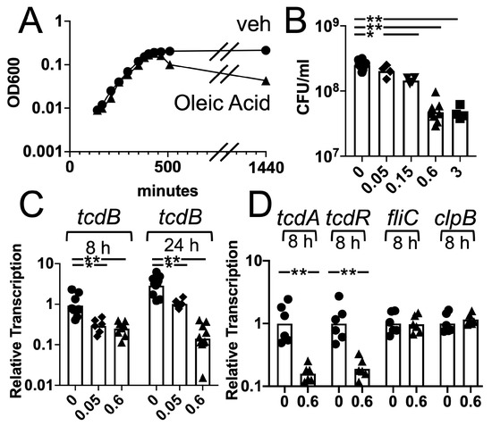 Gene transcription and the growth of C difficile in pre-reduced TY broth with or without oleic acid was analyzed at different concentrations. The exponential phase growth of C. difficile in TY broth containing 0.6 mM oleic acid (0.017% w/v) was not markedly altered in comparison to cultures containing the vehicle control (Figure 6A). However, when the cells transitioned to the stationary phase, a decrease in optical density was observed for the cultures grown with oleic acid. The decrease became more pronounced at 24 h of culturing. Plating cultures after 25 h of growth showed that CFU/mL declined in an oleic acid concentration-dependent manner (Figure 6B). Additionally, the spore levels after 51 h of culture were measured and found not to be affected by oleic acid (Supplementary Figure S8). These results demonstrated that while oleic acid did not reduce the growth rate of C. difficile, it compromised the viability of C. difficile bacterial cells during the stationary phase.