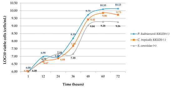 Growth curve experiments showed that different species of yeast grew well in 250 g/kg of sugarcane molasses with 10 g/kg of urea (Figure 1). The viable cell count in a medium solution started from 6.0 Log10 cell/mL, and the growth of P. kudriavzevii KKU20, C. tropicalis KKU20, and S. cerevisiae was 10.13, 9.73, and 9.26 Log10 cell/mL at 72 h of incubation, respectively. The exponential growth phase of yeast was detected between 36 and 60 h after being cultured in a medium solution. Yeasts’ cell growth remained continually stable over the 60 h of incubation. The rate of growth was revealed to be lower in S. cerevisiae (Crabtree-positive yeast) than in the other strain (Crabtree-negative yeast) (p < 0.01). At 72 h, the maximum growth rate was observed in 10.13 Log10 cell/mL of P. kudriavzevii KKU20, whereas the growth rates of C. tropicalis KKU20, and S. cerevisiae were found to be lower at 9.73 and 9.26 Log10 cell/mL, respectively (p < 0.01).