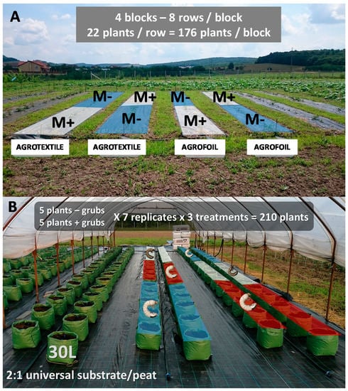 (A,B). Field (A) and greenhouse (B) experiment. Field experiment was replicated 4 times, having eight replicates for each cover. Greenhouse experiment was replicated seven times. Abbreviations: M. anisopliae present (M+) or absent (M−). Blue represents control, red represents insecticide, white represents fungal treatment.