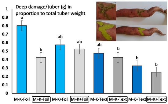 Sweet potato deep damage (defined in gram/tuber) on tubers with compost and fungal treatment and different soil cover systems. Analysis of variance (ANOVA) was used, followed by Tukey’s HSD test to compare the effect of M. anisopliae on tuber damages using average damage/tuber/plant/compost application/soil cover/block (n = 22). Grey bars represent M. anisopliae, blue bars represent control (no fungus). Bars represent standard errors. Upper figure presents damage assessment using gelatinized plastic. Different letters (a, b) means statistical significant differences.