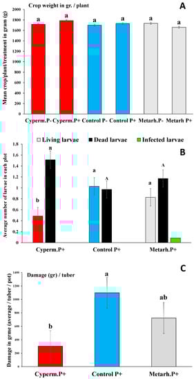 Again, the presence and development of M. anisopliae was detected in all containers M+. While no differences in crop weight (an average of 1700 gr/plants) were observed (Table 3, Figure 3A), variations in M. melolontha larvae survival and damage were detected between treatments (Figure 3B,C). Significantly lower numbers of survived larvae were detected in plots treated with α-cypermethrin (CipermP + ControlP+ U = 3.2, p < 0.01; CipermP + MetarhP+ U = 3.0, p < 0.01) and no differences were detected between Metarhizium treatment and control (MetarhP + ControlP+ U = 0.67, p < 0.23), where generally half of the larvae died before the end of the experiment. The numbers of dead larvae were higher in plots treated with α-cypermethrin (CipermP + ControlP+ U = 4.1, p < 0.01; CipermP + MetarhP+ U = 3.9, p < 0.01) and again no differences were detected between Metarhizium treatment and control (MetarhP + ControlP+ U = 0.88, p < 0.56) (Figure 3B). Signs of fungal infection among larvae were hardly observed at all (an average of one infected larva was found in 10 Metarhizium treated pots) at the end of the experiment in M+ treatments, and this did not make statistical analysis possible (Figure 3B). The damage rate of tubers also varied between treatments. Significantly lower damage rates were detected in pots with α-cypermethrin (CipermP + ControlP+ U = 5.2, p < 0.01; CipermP + MetarhP+ U = 3.9, p < 0.01), while no differences between Metarhizium treatment and control were observed (MetarhP + ControlP+ U = 0.66, p < 0.45) (Figure 3C).