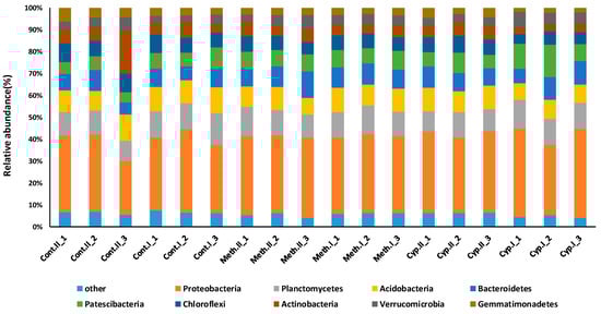Soil bacterial community analysis performed on amplicon sequencing of the 16S rRNA gene. Total genomic DNA was extracted using the DNeasy PowerSoil Kit (Qiagen), a part of the 16S rRNA gene was amplified with primers containing the Bacteria-specific sequences Bakt_341F (5′-CCTACGGGNGGCWGCAG-3′; Herlemann et al., 2011) and Bakt_805NR (5′-GACTACNVGGGTATCTAATCC-3′). DNA sequencing was performed on an Illumina MiSeq platform using MiSeq standard v2 chemistry as a service provided by the Genomics Core Facility RTSF, Michigan State University, USA. Cont.II represents control P−, Cont.I represents control P+, Meth.II represents Metarhizium P−, Meth.I represents Metarhizium P+, Cyp.II represents insecticide P− treatments, Cyp.I represents insecticide P+. Only data of 3 sample/treatment are presented.
