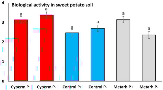 The following are available online at https://www.mdpi.com/2309-608X/6/3/116/s1, Figure S1. The scheme of the field experiment, Figure S2. Plots of the field experiment with or without foil cover, Figure S3. Experimental greenhouse at the beginning of the season, Figure S4. Experimental greenhouse in the middle of the season, Figure S5. Genus-level of the bacterial composition of sweet potato soil, Figure S6. NMDS ordination of soil samples based on the Bray-Curtis distance of the bacterial OTUs, Figure S7. Rarefaction curves of OTUs based on 16S rRNA gene amplicon sequencing data, Table S1. Bacterial species numbers (sobs, ACE and Chao-1) and diversity indices (inverse Simpson and Shannon-Weaver) calculated from 16S rRNA gene amplicon sequencing data. KI—represents control P+, KII—represents control P-, MI – represents Metarhizium P+, MII—represents Metarhizium P-, VI- represents insecticide P+, VII- represents insecticide P- treatment.