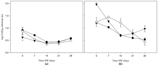 Total phenolic compounds (mg gallic acid equivalent per g substrate on dry weight (mg GAE/g substrate dw)) of the solid-state fermentation of agroindustrial residues: (a) Apple bagasse; (b) Agave mezcalero bagasse. Acetone and water (80:20 v/v (