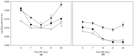 Total flavonoids (mg QE/g substrate dw) of the solid-state fermentation of agroindustrial residues: (a) apple bagasse; (b) agave mezcalero bagasse. Acetone and water (80:20 v/v (