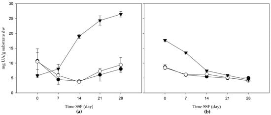 Total triterpenes (mg UA/g substrate dw) of the solid-state fermentation of agroindustrial residues: (a) apple bagasse; (b) agave mezcalero bagasse. Acetone and water (80:20 v/v (