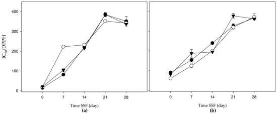 50% inhibitory concentration in 2,2-diphenyl-1-picrylhydrazyl (DPPH (IC50/DPPH)) of the solid-state fermentation of agroindustrial residues: (a) apple bagasse; (b) agave mezcalero bagasse. Acetone and water (80:20 v/v (