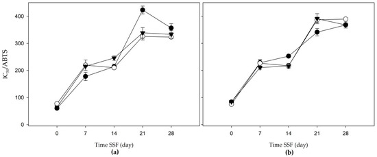 A 50% inhibitory concentration in 2, 2′-azino-bis (3-ethylbenzothiazoline)-6 ammonium sulfonate (ABTS (IC50/ABTS)) of the solid-state fermentation of agroindustrial residues: (a) apple bagasse; (b) agave mezcalero bagasse. Acetone and water (80:20 v/v (