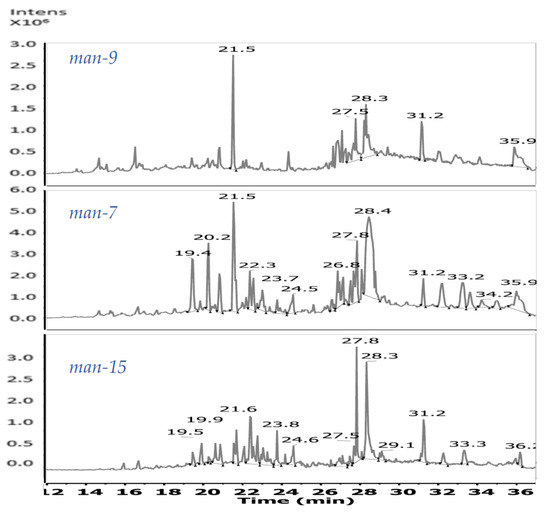 2.6. Analysis of Organic Extracts by LC–MS