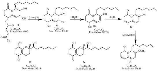 - Helaly, S.E.; Thongbai, B.; Stadler, M. Diversity of biologically active secondary metabolites from endophytic and saprotrophic fungi of the ascomycete order Xylariales. Nat. Prod. Rep. 2018, 35, 992–1014. [Google Scholar] [CrossRef]