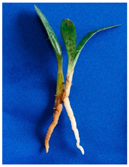 A plant of Oeceoclades maculata showing an older and darker mycorrhizal root on the left and a younger and paler non-mycorrhizal root on the right. Roots belonging to the two types were checked for their mycorrhizal status by microscopic screening before being subject to molecular analyses.