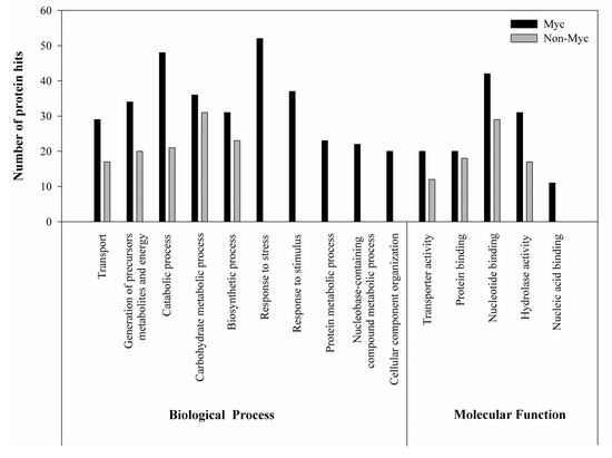 Proteins identified in the label-free LC-MS/MS were categorized by gene ontology (GO) annotation and the Blast2Go algorithm (Figure 2). Proteins from Myc roots could be classified into 10 categories of biological functions, whereas only five categories were represented in Non-Myc roots. The most abundant categories in Myc roots were “response to stress” (16% of proteins) and “catabolic process” (15% of proteins), whereas the most abundant category (28% of proteins) in Non-Myc roots was “carbohydrate metabolic process”.