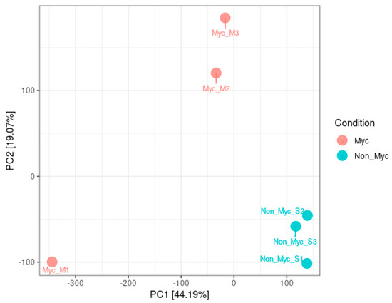 Principal Component Analysis (PCA) of the complete transcriptomes of the three biological replicates of mycorrhizal (Myc) and non-mycorrhizal (Non-Myc) root samples of Oeceoclades maculata.