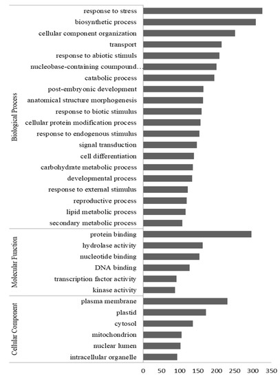 Gene ontology (GO) categorization of transcripts up-regulated (fold change >1.5; p < 0.05) in mycorrhizal roots of Oeceoclades maculata. Bars indicate the number of reads. X-axis, the number of reads.