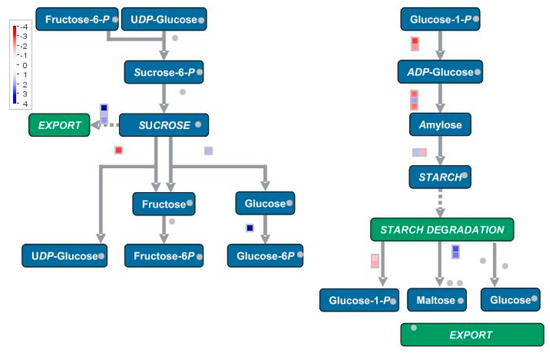 Pathway level display of genes involved in sucrose and starch metabolism, produced with MapMan [31]. Changes of transcripts levels in Myc and Non-Myc Oeceoclades maculata roots are indicated in the squares. Blue squares represent genes up-regulated, whereas red squares represent genes down-regulated in Myc roots, as compared with Non-Myc roots. Grey dots represent genes that were not mapped in the current dataset. A reference scale is on the left.