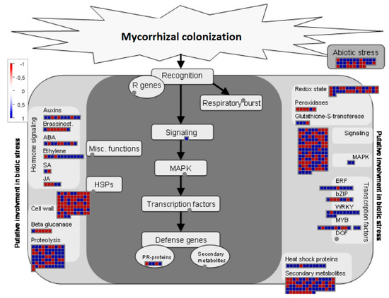 Several transcription factors, such as ethylene-responsive transcription factors, MYB-related, WRKY homologs, or containing MADS-box (MCM1 AGAMOUS DEFICIENS SRF), were found to be regulated at the transcriptional level, most of them being up-regulated in Myc roots (Table S7). Many of these transcription factors are involved in defense response to biotic or abiotic stress and are considered in Figure 6.