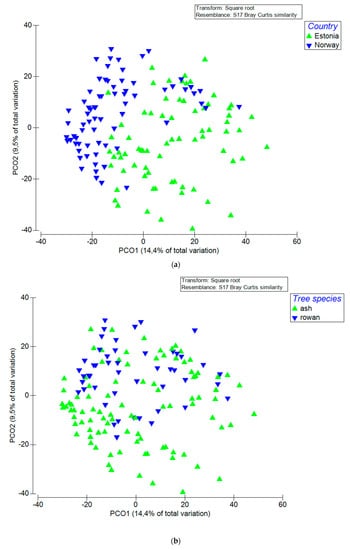 Permutational ANOVA showed that the sampling site (country) was the most important factor, explaining 14.5% of the variation in fungal composition (p < 0.001), followed by the sampling time (4.9%; p < 0.001), occurrence of disease symptoms (3.7%; p < 0.001), washing treatment (2.1%; p < 0.005) and tree species (1.8%; p < 0.05). Interactions between tested factors also contributed to some variation: site x date, site x symptoms, date x symptoms as well as site x date x symptoms explained 2.6%, 3.3%, 1.5% and 1.8% of the variation, respectively, when data from both sites were pooled together. When considering the two sampling sites separately, in Norway the most important factor explaining variation in fungal composition was tree species (15.9%; p < 0.01), followed by sampling date (15.8%; p < 0.01), sampling date and symptom interaction (15.6%; p < 0.01), symptom (10.9%; p < 0.01), tree species and sampling date interaction (8.9%; p < 0.05). In Estonia, tree species explained the largest part of the variation (18.9%; p < 0.01), followed by sampling date x symptom interaction (14.7%; p < 0.01) and sampling date (14.5%; p < 0.01). The effects of sampling site, tree species and sampling date on fungal composition of pooled data are illustrated in the PCoA plots (Figure 1), the two primary axes collectively accounted for 23.9% of the variation in the fungal community. PCoA plots showing differences between different dates and tree species per site are included in (Supplementary Materials Figure S4).