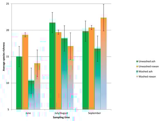 Average fungal species richness (species per sample) from PacBio data in unwashed and washed leaflets of ash and rowan across the sampling period. Data from Estonia and Norway pooled (n = 144).