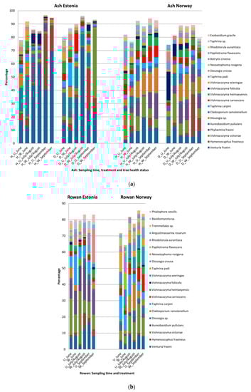 On ash, the 20 most common species included Venturia fraxini Aderh, H. fraxineus, nine species representing basidiomycetous yeasts in genera Vishniacozyma, Dioeszegia and Rhodotorula, five biotrophic species in genera Phyllactinia, Taphrina and Exobasidium, and four species in genera Aureobasidium, Cladosporium, Botrytis, Neosetophoma (Figure 3a; Supplementary Materials Tables S1 and S2). Together the read percentages of the 20 most common species covered 48% to 97% of all the sequence reads in Estonia and 76% to 94% in Norway, the lowest total read percentage of these species being in general in the samples collected on 30th June. When considering the average across-the-season read proportion of these 20 species for unwashed and washed leaflets, in the healthy trees the read proportions were higher in unwashed than washed leaflets, 88% and 73% for Estonia, and 90% and 87% for Norway, respectively. An opposite pattern was observed for the diseased trees, the average across-the-season read proportions of these 20 species from unwashed and washed leaflets being 86% and 88% for Estonia, and 83% and 85% for Norway, respectively (Figure 3). However, none of the abovementioned differences were statistically significant (p > 0.05).