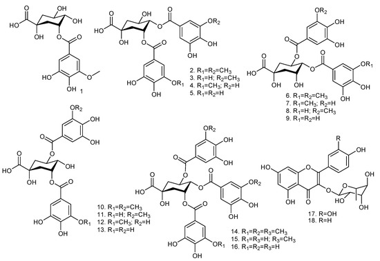 Chemical structures of the galloylquinic acids and flavonoids present in Copaifera species: 3-O-(3-O-methyl galloyl) quinic acid (1); 3,4-di-O-(3-O-methyl galloyl) quinic acid (2); 3-O-(galloyl)-4-O-(3-O-methyl galloyl) quinic acid (3); 3-O-(3-O-methyl galloyl)-4-O-(galloyl) quinic acid (4); 3,4-di-O-(galloyl) quinic acid (5); 4,5-di-O-(3-O-methyl galloyl) quinic acid (6); 4-O-(3-O-methyl galloyl)-5-O-(galloyl) quinic acid (7); 4-O-(galloyl)-5-O-(3-O-methyl galloyl) quinic acid (8); 4,5-di-O-(galloyl) quinic acid (9); 3,5-di-O-(3-O-methyl galloyl) quinic acid (10); 3-O-(galloyl)-5-O-(3-O-methyl galloyl) quinic acid (11); 3-O-(3-O-methyl galloyl)-5-O-(galloyl) quinic acid (12); 3,5-di-O-(galloyl) quinic acid (13); 3,4,5-tri-O-(3-O-methyl galloyl) quinic acid (14); 3,5-di-O-(galloyl)-4-O-(methyl galloyl) quinic acid (15); 3,4,5-tri-O-(galloyl) quinic acid (16); quercetrin (17); afzelin (18). Adapted from Furtado et al. [5].