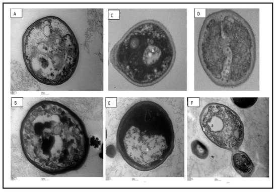 Cellular alterations in Candida glabrata cells after exposure to Copaifera leaf extracts, observed with transmission electron microscopy. (A)—control (untreated), (B)—treatment with 2 µg/mL amphotericin, (B,C)—0.5 × MIC Copaifera paupera, (D)—0.5 × MIC Copaifera reticulata, (E)—1 × MIC C. paupera, and (F)—1 × MIC C. reticulata leaf extracts. There is intense vacuolization (a) and plasma membrane destruction (b). Magnification (A,B,D): 25,000×; (C,E): 20,000×, (F): 5000×.
