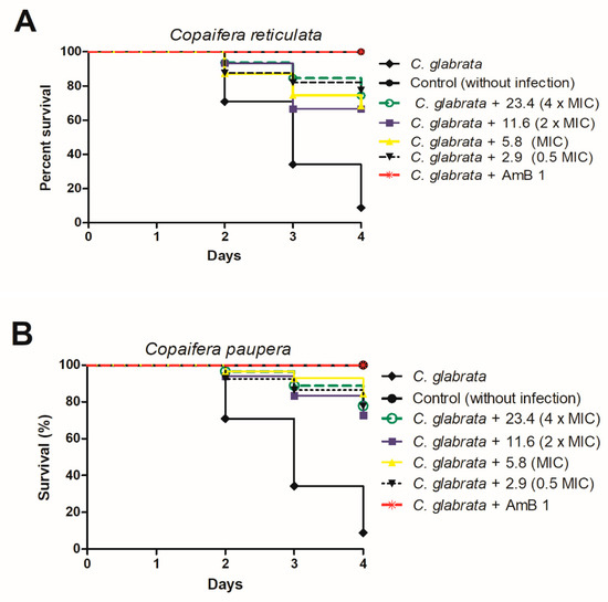 Survival curve of C. elegans infected with C. glabrata ATCC 2001 and treated with concentrations equivalent to 0.5 MIC, MIC, 2 × MIC, and 4 × MIC of Copaifera reticulata (A) and Copaifera paupera (B). Amphotericin B at 1 µg/mL was used as control. Statistical differences were observed between the groups treated with all the C. reticulata concentrations and the nontreated control group (C. glabrata) (p < 0.0001). In addition, statistical differences were observed between the groups treated with all the C. paupera concentrations and the nontreated control group (C. glabrata) (p < 0.0001). Log-rank test (Mantel–Cox).