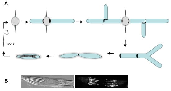 Young mycelia of newly germinated Ashbya spores show a relatively slow growth speed, which increases considerably, i.e., > tenfold to about 200 µm/h, in mature hyphae [35]. About 24 h after induction of spores into rich medium, hyphal tips start a tip splitting process (Figure 1A). This replaces lateral branching for the formation of new hyphae and is characteristic for filamentous fungi in the genus Eremothecium. Septation not only compartmentalizes hyphae; hyphal segments are required for the formation of sporangia. Mutants that are aseptate, e.g., cyk1, fail to form sporangia and fail to sporulate [37]. Hyphal fragmentation during sporulation results in isolated sporangia that often bear eight spores. Ashbya spores harbor filaments at their tips and bundles of spores aggregate via these filaments. In a sporangium, two bundles of spores are formed connected via these filaments (Figure 1B).