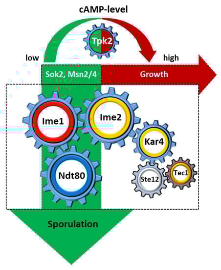 Spore germination, i.e., the breaking of spore dormancy, requires the presence of water and nutrients, particularly glucose in S. cerevisiae [86]. Then a concert of transcription factors, including Sok2, orchestrates germination subprograms, [87]. In Schizosaccharmyces pombe signaling via the cAMP/PKA-pathway is required for spore germination and mutants in the catalytic subunit of PKA, pka1, showed severe germination defects [88]. Similarly, we found that Ashbya mutants in TPK2 showed strong germination defects [59]. This indicates that Tpk2 is required as a developmental regulator both at the entry of sporulation and at the exit of spore dormancy (Figure 3).
