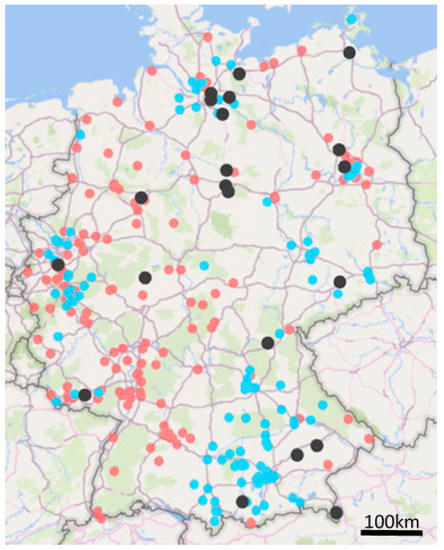 Figure 1. Sample origin, black—private breedings, blue—SYNLAB Vet, red—LABOKLIN.