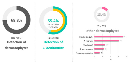 19. Sabou, M.; Denis, J.; Boulanger, N.; Forouzanfar, F.; Glatz, I.; Lipsker, D.; Poirier, P.; Candolfi, E.; Letscher-Bru, V. Molecular identification of Trichophyton benhamiae in Strasbourg, France: A 9-year retrospective study. Med. Mycol. 2017, 56, 723–734. [Google Scholar] [CrossRef] [PubMed]