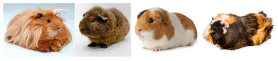 Figure 3. Guinea pig races with their different fur forms: (from left to right) longhaired guinea pigs, Rex guinea pigs, smooth-haired guinea pigs, curly-coated guinea pig (shutterstock.com/free-license images).