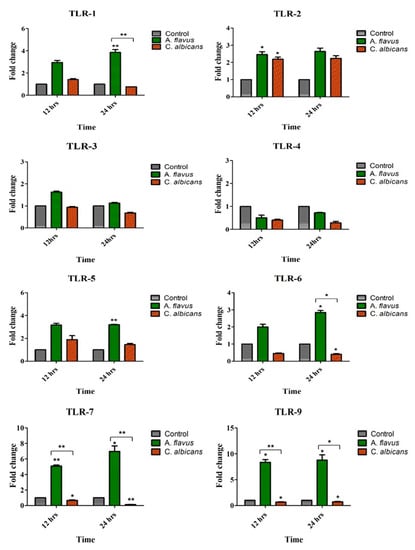 3.1. Toll-Like Receptors’ (TLRs) Expression Profile in Response to Aspergillus flavus and Candida albicans in Microglia