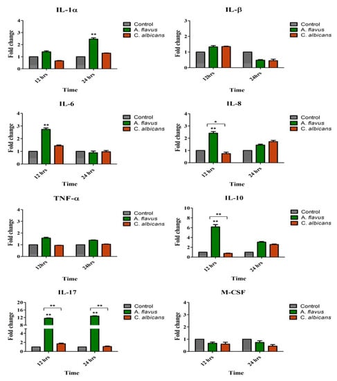 Similar to TLRs’ activation of microglial cells by A. flavus, there was an increased expression of proinflammatory mediators such as IL-6 (2.7-fold) and IL-8 (2.4-fold) at 12 h postinfection while IL-1α (2.4-fold) was expressed at 24 h p.i. compared to uninfected cells. Similarly anti-inflammatory cytokine IL-10 (6-fold) was also upregulated at 12 h p.i. (p < 0.005) along with IL-17 (11.6-fold; p < 0.005) which showed continued increased expression up to 24 h p.i. (12.7-fold, p < 0.005) (Figure 2). There was however, no significant expression of IL1β, TNF-α and M-CSF in microglia cells challenged with both A. flavus as well as C. albicans. Interestingly none of the immune mediators tested were expressed in cells infected with C. albicans. Comparing the expression between the two fungal pathogens, we found that microglial cells infected with A. flavus were significantly upregulated in IL-8 (p < 0.05), IL-10 (p < 0.005) and IL-17 (p < 0.005) at 12 h p.i. whereas in C. albicans infected cells these mediators were downregulated at the indicated time points (Figure 2).