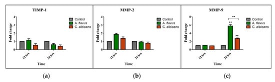 Matrix metalloproteinases’ (MMPs), such as MMP-2, MMP-9 and Tissue Inhibitor of metalloproteinases (TIMP-1), mRNA levels were assessed in CHME-3 cells challenged with A. flavus and C. albicans compared to uninfected cells and we observed an increased mRNA expression of only MMP-9 at 24 h p.i. (5.8-fold and 2.7-fold, respectively) (p < 0.005) (Figure 3c). However, the expression of MMP-9 in A. flavus infected cells was significantly higher (p < 0.005) than cells infected with C. albicans (Figure 3c). In comparison, MMP-2 and its inhibitor TIMP-1 had no significant expression in cells infected with both A. flavus and C. albicans (Figure 3a,b).