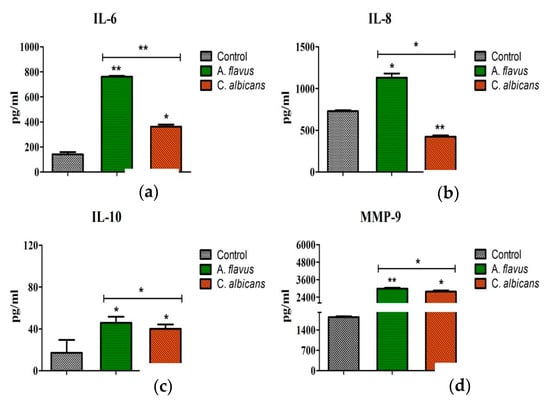 The translation of these mRNA transcripts was confirmed by assessing the protein levels of these immune mediators. Consistent with qRT-PCR data, significantly increased concentrations of IL-10 (46 pg/mL; p < 0.05), IL-6 (762 pg/mL; p < 0.005), and IL-8 (1130 pg/mL; p < 0.05) accumulated in the culture media of A. flavus stimulated CHME-3 cells at 24 h p.i. compared to C. albicans (IL-6 = 362 pg/mL; p < 0.05, IL-8 = 423 pg/mL; p < 0.005, IL-10 = 40 pg/mL; p < 0.05) (Figure 4a–c). The induction of MMP-9 levels in particular showed elevated levels in cells infected with both A. flavus and C. albicans (2993.66 ± 49.01 pg/mL vs. 2779.00 ± 74.22 pg/mL, p = 0.05) at 24 h postinfection. The protein concentrations of MMP-2 and MMP-9 were also assessed and MMP-2 was not detectable in the supernatant of both A. flavus and C. albicans challenged cells. MMP-9 however, showed a high expression in CHME-3 cells infected with A. flavus (2994 pg/mL ± 49; p < 0.005) compared to C. albicans (2779 pg/mL ± 74; p < 0.05) (Figure 4d).