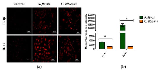 To confirm the mRNA expression observed for the remaining mediators, immunofluorescence staining was also carried out for the IL-17 and IL-1β expression in CHME-3 cells challenged with both A. flavus and C. albicans (Figure 5a), and the fluorescence intensities were compared to the uninfected cells at 12 h p.i. Similar to mRNA transcription levels, a higher protein expression of IL-17 was observed in cells infected with A. flavus compared to those infected with C. albicans. IL-1β however, showed a moderate expression in CHME-3 cells challenged with both A. flavus and C. albicans (Figure 5b).